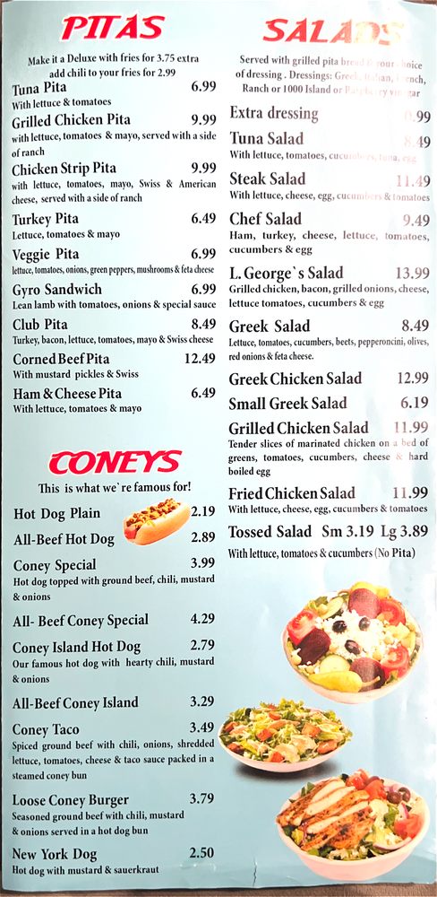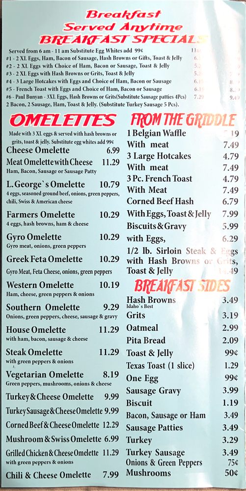 L George’s Coney Island, a popular American restaurant in Detroit, offers a wide range of breakfast options available all day. From hearty steak and eggs to flavorful omelettes like the Greek Omelette and the L. George's Omelette, there is something for everyone. Customers rave about the food, with Brandy F. describing it as amazing and Q J. calling it the Best on the Westside. Vegetarian options are plentiful, and the veggie omelet with perfectly cooked hash browns is a standout. Whether you're craving a classic Coney Island dish or a delicious breakfast special, L George’s Coney Island is a reliable choice for a satisfying meal. With delivery and takeout options available, you can enjoy their tasty offerings wherever you are. Visit L George’s Coney Island for a satisfying and delicious dining experience.